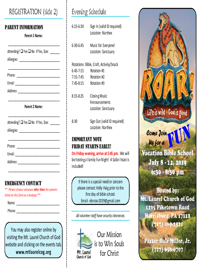 REGISTRATION (side 2) Parent InformatIonEvening Schedule 6:156:30Sign In (valid ID required) Location: Narthex6:306:45Music for Everyone! Location: SanctuaryParent 1 Name: Attending? Yes No If Yes,