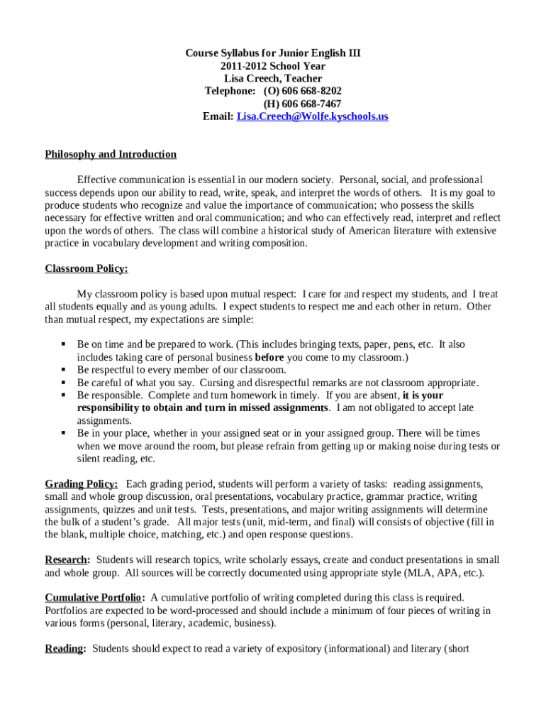 The Course Syllabus for Junior English III is a fillable form in MS Word extension that can be filled-out and signed for certain needs. Next, it is provided to the actual addressee in order to provide certain info of any kinds. The completion and signing is possible in hard copy or using an appropriate service like PDFfiller. These tools help to fill out any PDF or Word file online. It also lets you edit it according to your requirements and put legit e-signature. Upon finishing, you send the Course Syllabus for Junior English III to the recipient or several ones by email or fax. PDFfiller has a feature and options that make your blank printable. It includes a variety of settings for printing out. It doesn't matter how you deliver a form - in hard copy or electronically - it will always look neat and firm. In order not to create a new editable template from scratch every time, turn the original document as a template. Later, you will have a customizable sample.