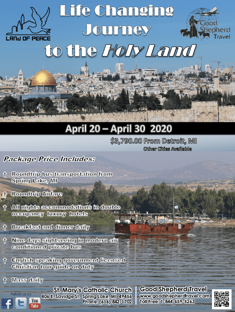 St. Mary's Catholic Church406 E. Saving St. Spring Lake, MI 49456 Phone: (616) 8421702Good Shepherd Travel.goodshepherdtravel.com Toll Free: 18446595263The Holy land: In the footsteps of Jesus Pilgrimage