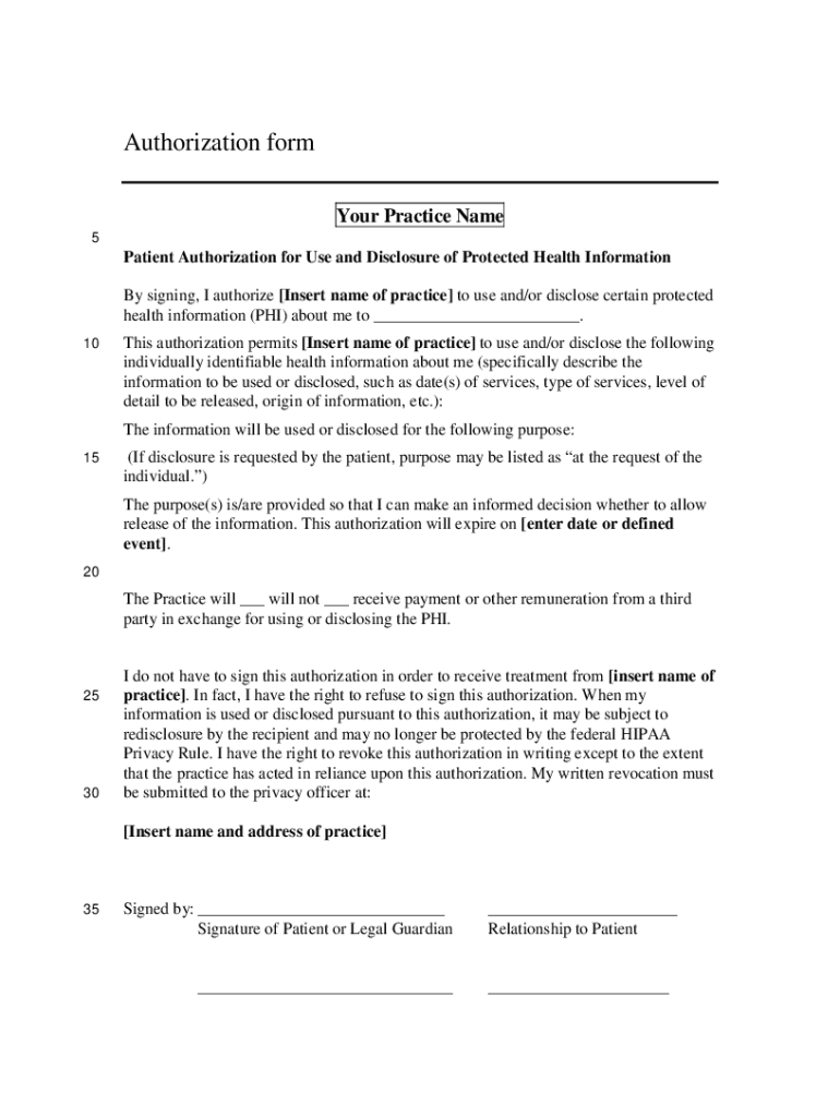 Authorization from Your Practice Name 5Patient Authorization for Use and Disclosure of Protected Health Information By signing, I authorize Insert name of practice to use and/or disclose certain protected