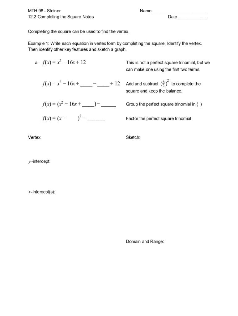 MTV 95 Steiner 12.2 Completing the Square Forename Date Completing the square can be used to find the vertex. Example 1: Write each equation in vertex form by completing the square. Identify the vertex.