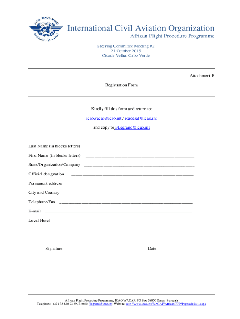 International Civil Aviation Organization African Flight Procedure Program Steering Committee Meeting #2 21 October 2015 MIDADE Vela, Cab Reattachment B Registration FormKindly fill this form and