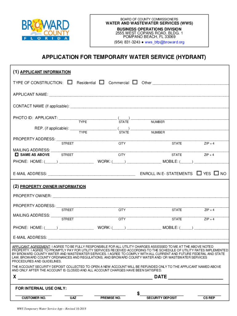BOARD OF COUNTY COMMISSIONERSWATER AND WASTEWATER SERVICES (WAS) BUSINESS OPERATIONS DIVISION 2555 WEST COP ANS ROAD, BLDG. 1 POMPANO BEACH, FL 33069 (954) 8313243 was BFP Broward. Reapplication FOR