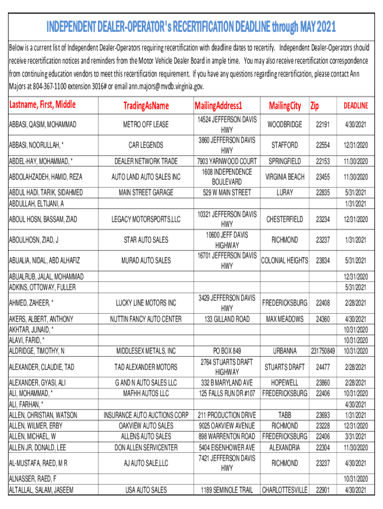 Below is a current list of Independent DealerOperators requiring recertification with deadline dates to recertify. Independent