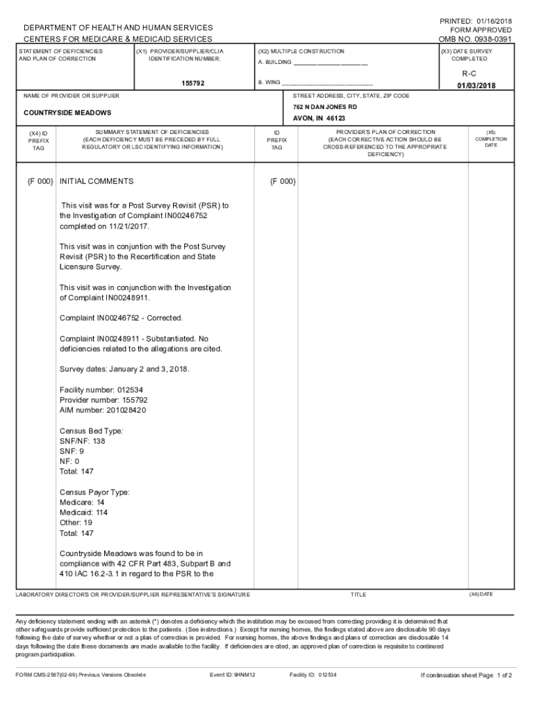 PRINTED: 01/16/2018 FORM APPROVEDDEPARTMENT OF HEALTH AND HUMAN SERVICES CENTERS FOR MEDICARE & MEDICAID SERVICES STATEMENT OF DEFICIENCIES AND PLAN OF CORRECTION(X1) PROVIDER/SUPPLIER/CIA IDENTIFICATION
