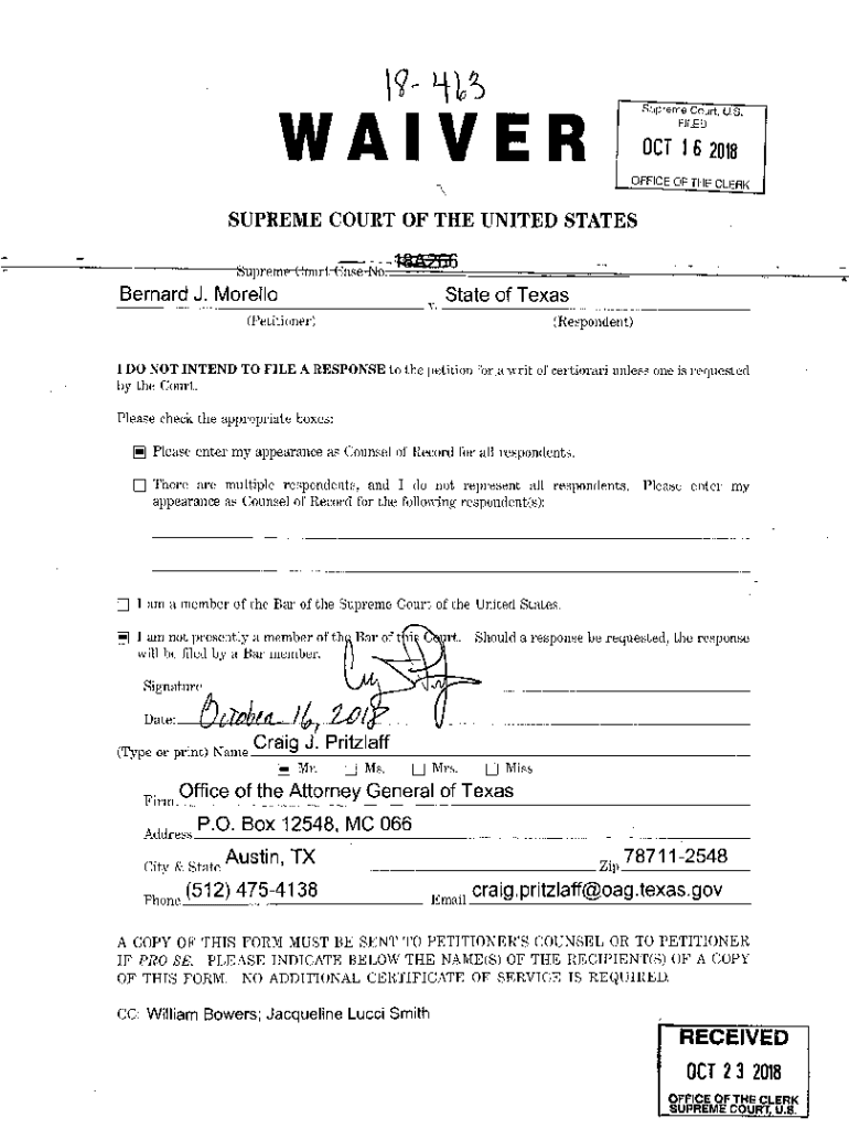 Supremr3mirt6,sent. Bernard J. Morel lo... State of Texas(Petitioner)(Respondent)I DO NOT INTEND TO FILE A