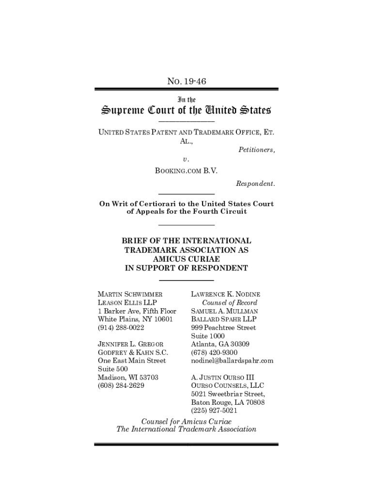 NO. 1946 In supreme Court of the United States PATENT AND TRADEMARK OFFICE, ET. AL., Petitioners, v. BOOKING.COM B.V. Respondent. On Writ of Certiorari to the United States Court of Appeals for the