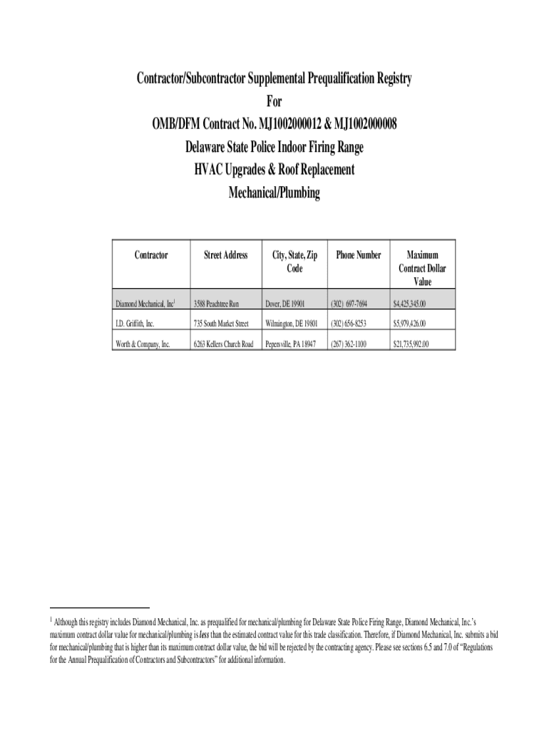 Contractor/Subcontractor Supplemental Prequalification Registry For OMB/DFM Contract No. MJ1002000012 & MJ1002000008 Delaware State Police Indoor Firing Range HVAC Upgrades & Roof Replacement Mechanical/PlumbingContractorStreet