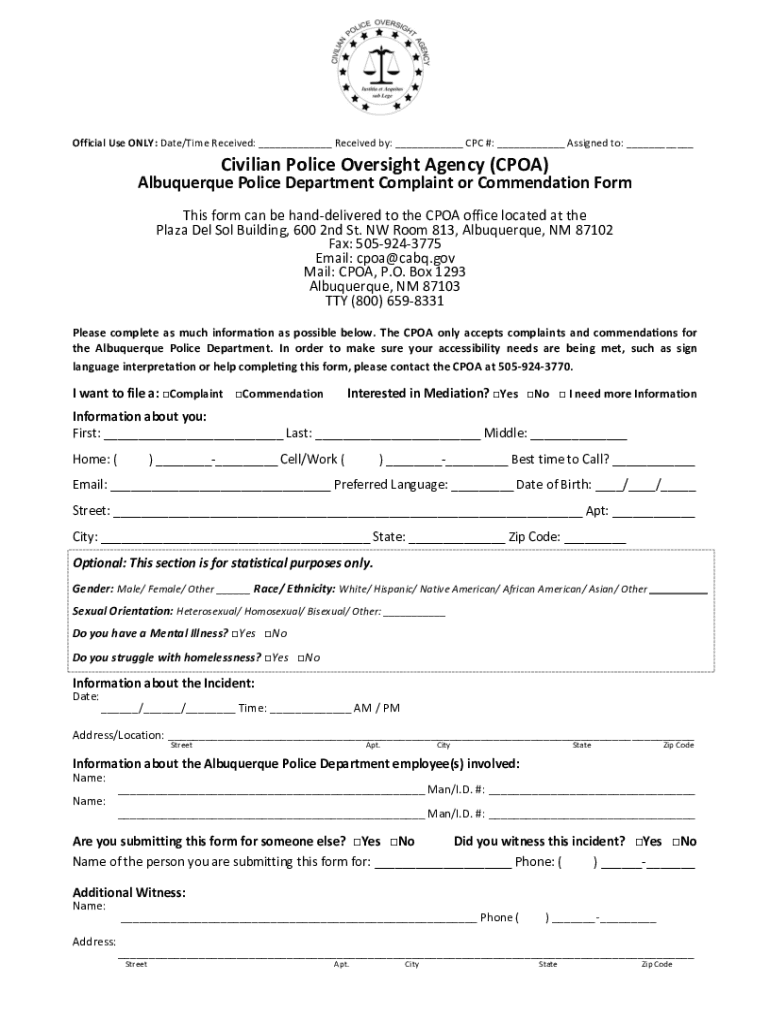 Official Use ONLY: Date/Time Received: Received by: CPC #: Assigned to: Civilian Police Oversight Agency (CPA)Albuquerque Police Department Complaint or Commendation Form This form can be hand delivered