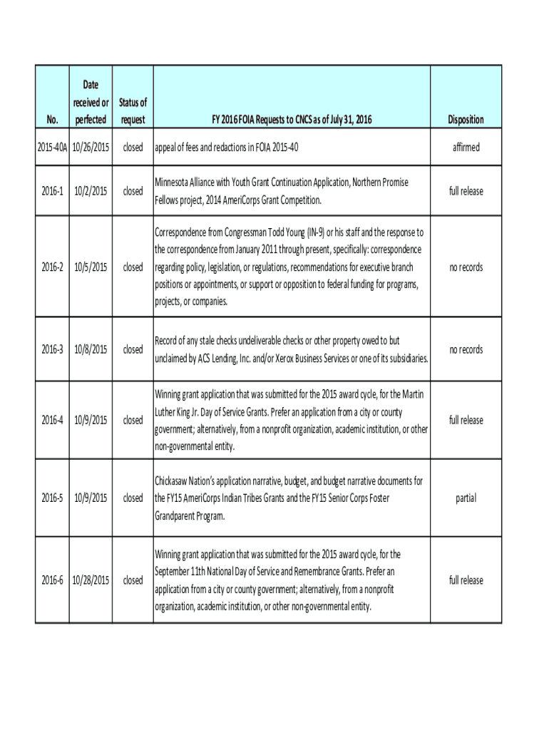 Get the free No. Date received or perfected Status of request FY 2016 ...