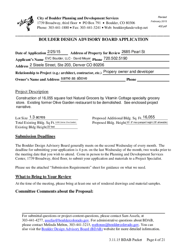 Boulder Design AdvisoryBoard Agenda Wednesday, March 11, 20151777 Broadway, West Conference Room4 5:30 p.m. The following items will be discussed:1. 2. 3. 4. Call to Pre-approval of MinutesNatural