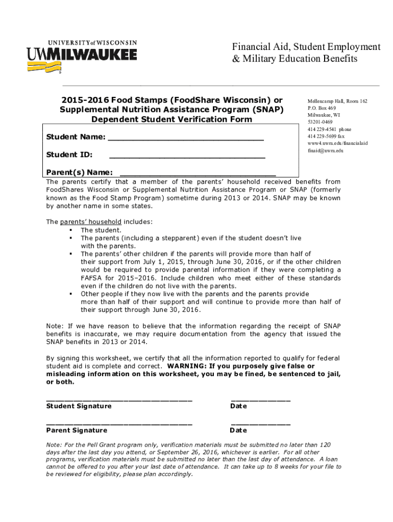 Financial Aid, Student Employment & Military Education Benefits20152016 Food Stamps (Food Share Wisconsin) or Supplemental Nutrition Assistance Program (SNAP) Dependent Student Verification Form Student