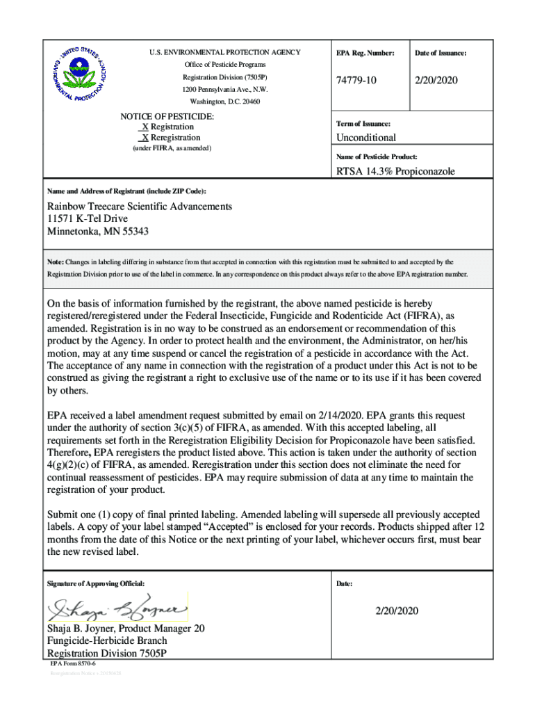 U.S. ENVIRONMENTAL PROTECTION AGENCY EPA Reg. Number:Date of Issuance:74779102/20/2020Office of Pesticide Programs