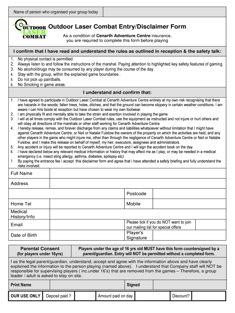 Players participating in outdoor laser combat and their parents or guardians if the player is under 16 years old need to complete this form.