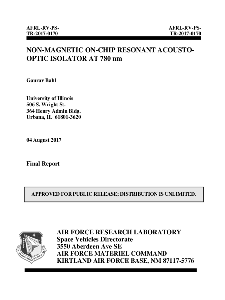 AFRLRVPSTR20170170AFRLRVPSTR20170170NONMAGNETIC CHIP RESONANT ACOUSTOOPTIC ISOLATOR AT 780 nm