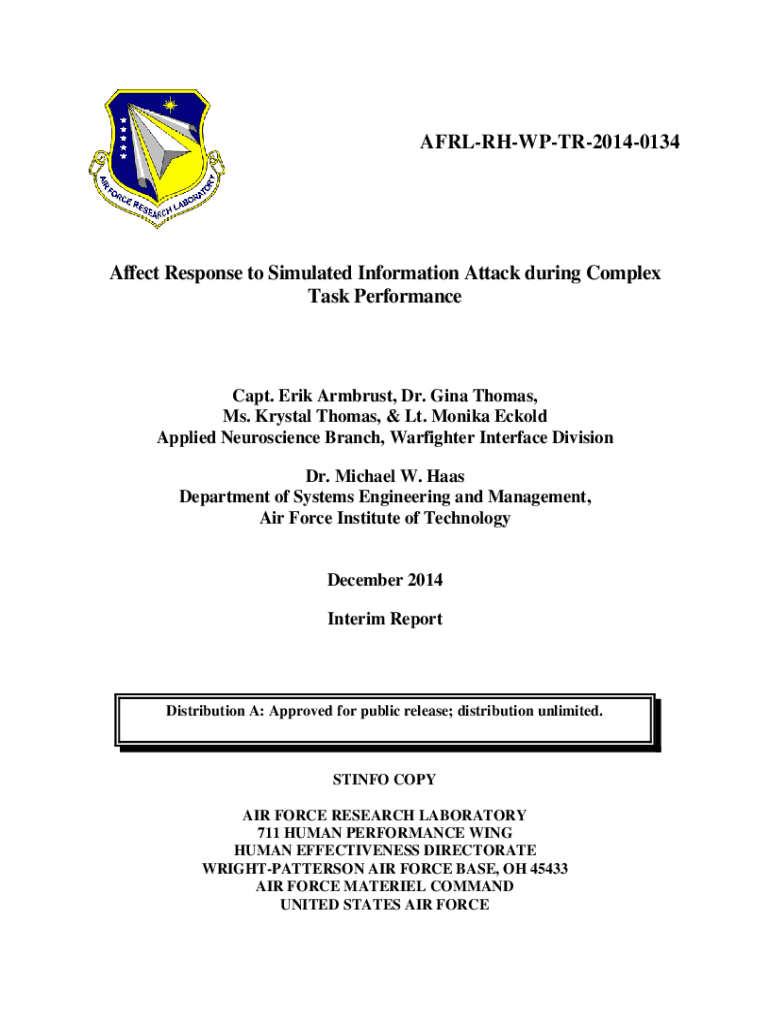 AFRLRHWPTR20140134Affect Response to Simulated Information Attack during Complex Task Performance Capt. Erik Armrest, Dr. Gina Thomas, Ms. Krystal Thomas, & Lt. Monika Cold Applied Neuroscience Branch,