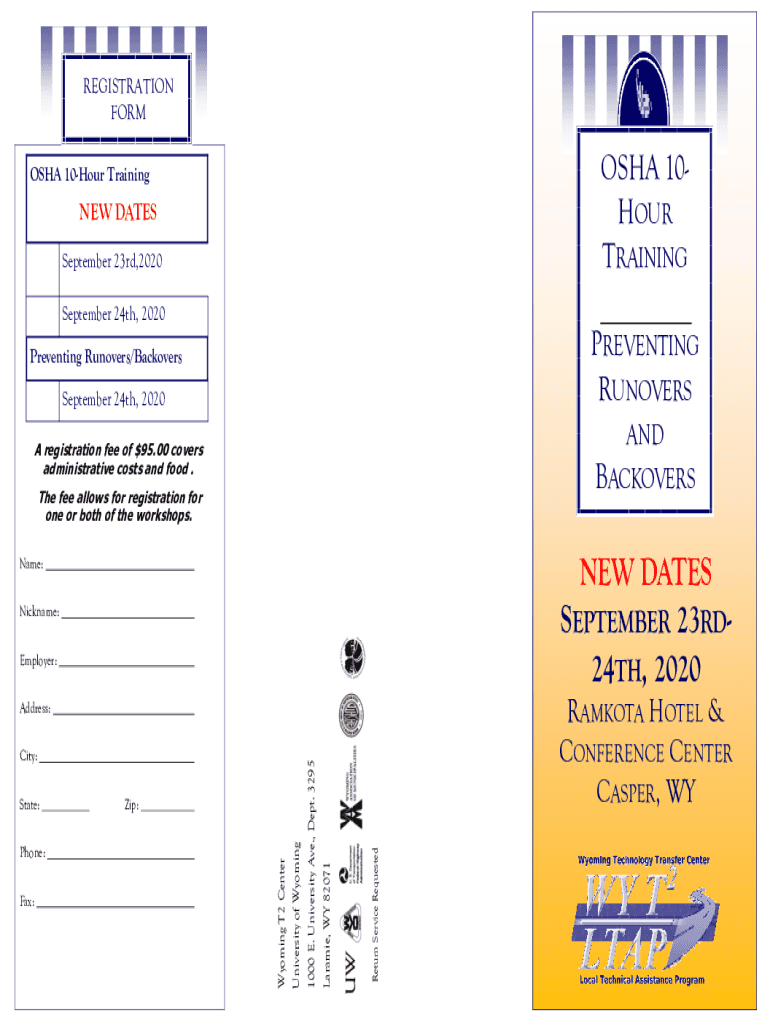 REGISTRATION FORMOSA 10HOUR TRAINING OSHA 10Hour Training DATES September 23rd,2020September 24th, 2020PREVENTING RUNOVERSPreventing Run overs/Back overs September 24th, 2020AND BACKERS registration