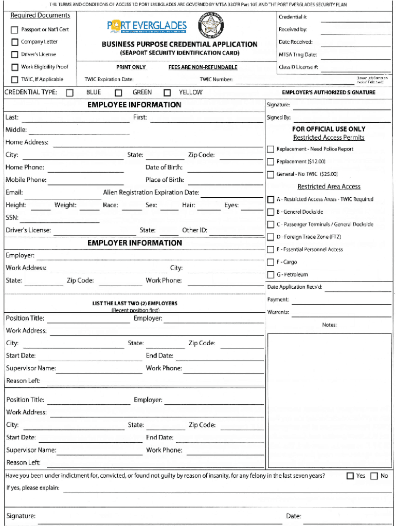 THE TERMS AND CONDITIONS ACCESS TO PORTEVERGLADES ARE GOVERNED BY MTA 33CFRPart 1OS AND REPORT EVERGLADESSECURITY PLAN Required Documents D D D DP. T EVERGLADESPassport or Nat 'I Cert.... u1 /.l×3l