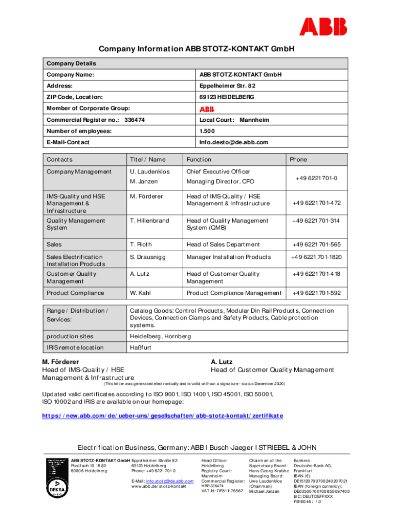 Email, fax, or share your company information abb stotz-kontakt form via URL. You can also download, print, or export forms to your preferred cloud storage service.