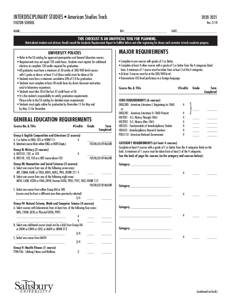 INTERDISCIPLINARY STUDIES American Studies Track20202021FULTON SCHOOLMATE: Rev. 2/18 ID#: DATE: THIS CHECKLIST IS AN UNOFFICIAL TOOL FOR PLANNING. Matriculated students and advisors should consult
