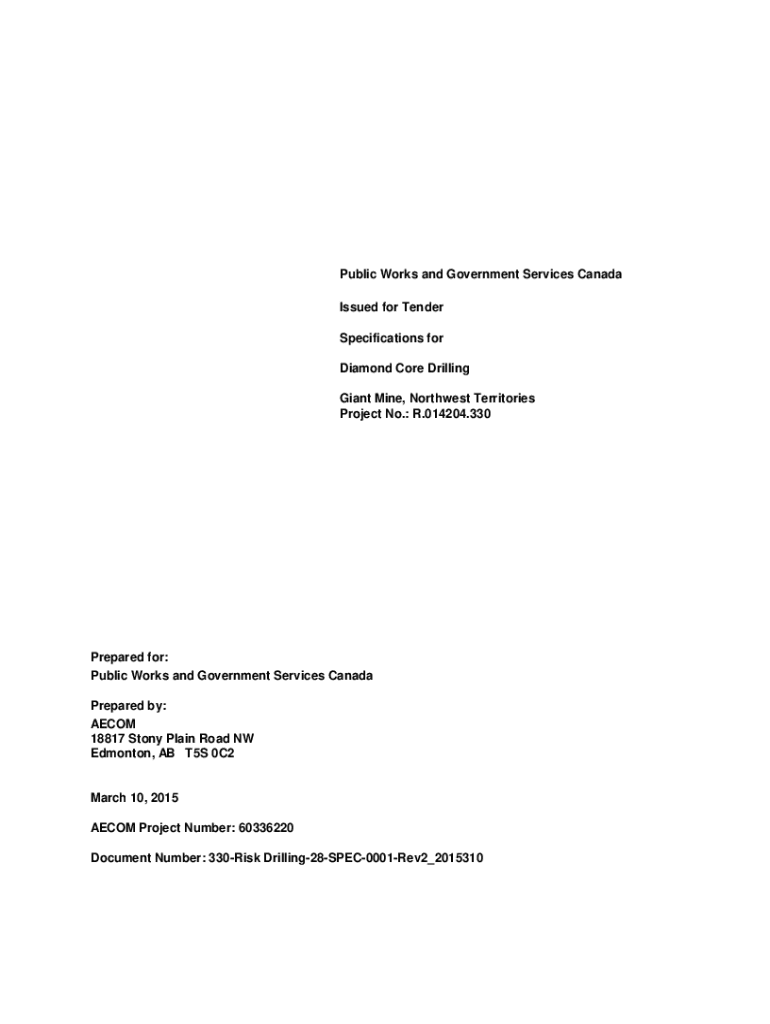 Public Works and Government Services Canada Issued for Tender Specifications for Diamond Core Drilling Giant Mine, Northwest Territories Project No.: R.014204.330Prepared for: Public Works and Government