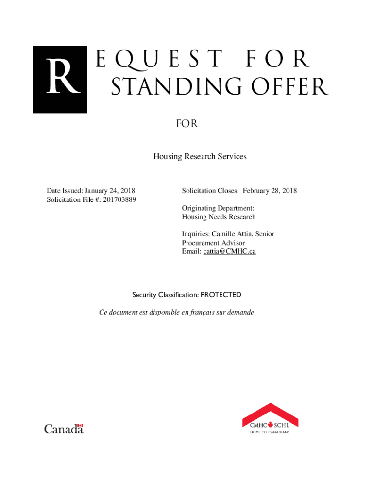 REQUEST FOR STANDING OFFER Housing Research ServicesDate Issued: January 24, 2018, Solicitation File #: 201703889Solicitation Closes: February 28, 2018, Originating Department: Housing Needs Research