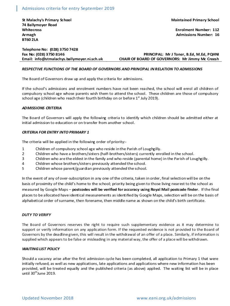 Get the free AdmissionsSt Malachy's Primary School & Nursery Unit