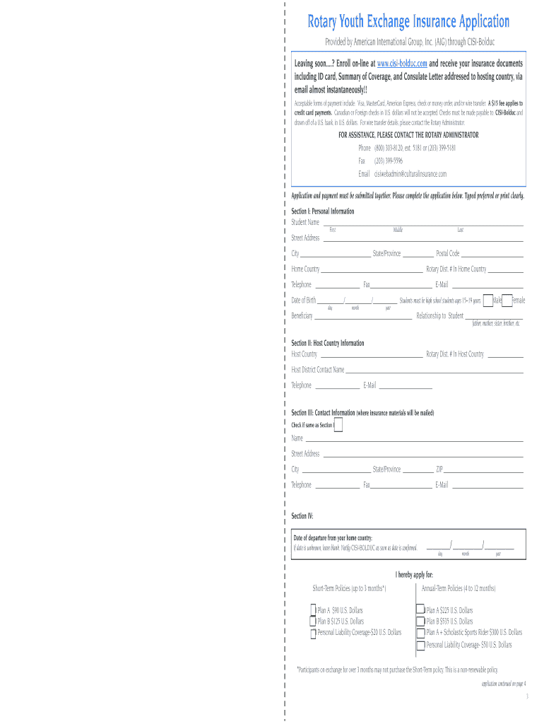 The Rotary Youth Exchange Insurance Application is a crucial form utilized by students involved in the Rotary Youth Exchange program. This document ensures that participants have the necessary insurance coverage during their exchange experience. The insurance is provided by CISI-Bolduc, offering peace of mind to both students and their families. It serves as a protection mechanism while students engage in activities around the globe, covering unforeseen incidents.