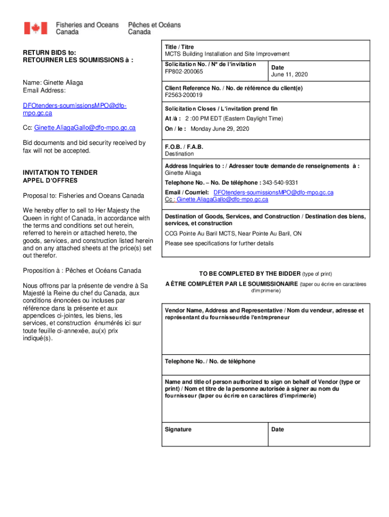 RETURN BIDS to: RETURNER LES COMMISSIONS :Name: Ginette Alias Email Address: DFOtenderssoumissionsMPO compo.GC.cattle / Title MCTS Building Installation and Site Improvement Solicitation No. / N de