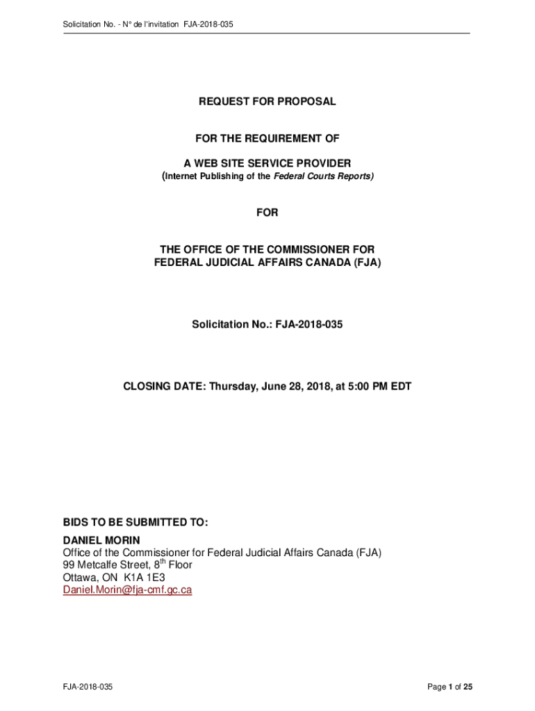 Solicitation No. N de invitation FJA2018035REQUEST FOR PROPOSAL THE REQUIREMENT OF A Website SERVICE PROVIDER (Internet Publishing of the Federal Courts Reports)FORTH OFFICE OF THE COMMISSIONER FOR