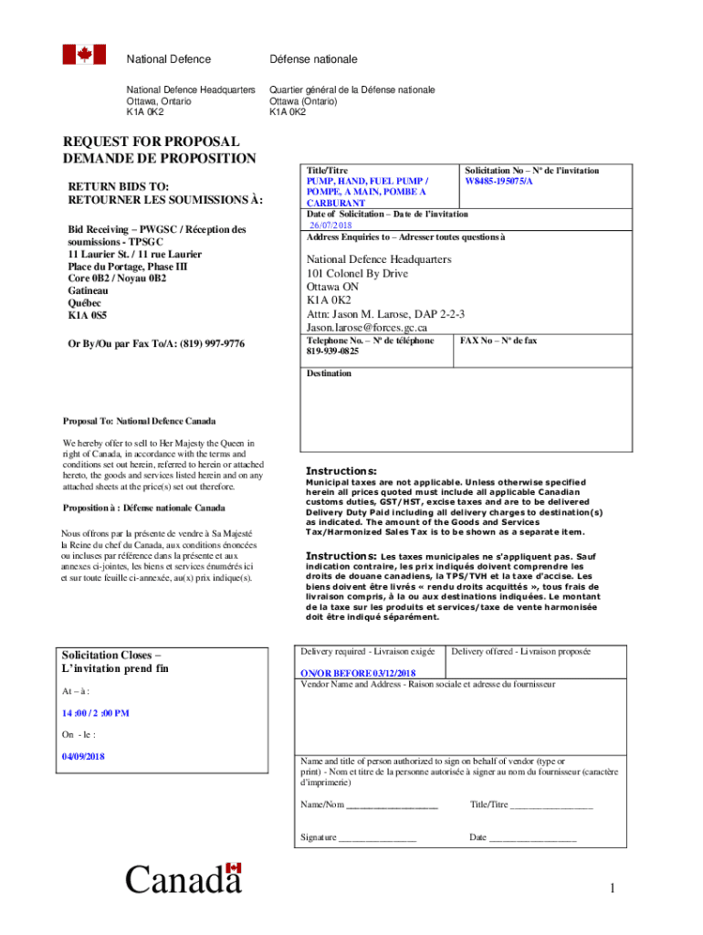 National DefenceDfense nationaleNational Defense Headquarters Ottawa, Ontario K1A 0K2Quartier gnarl DE la Defense national Ottawa (Ontario) K1A 0K2REQUEST FOR PROPOSAL DEMAND DE PROPOSITION RETURN