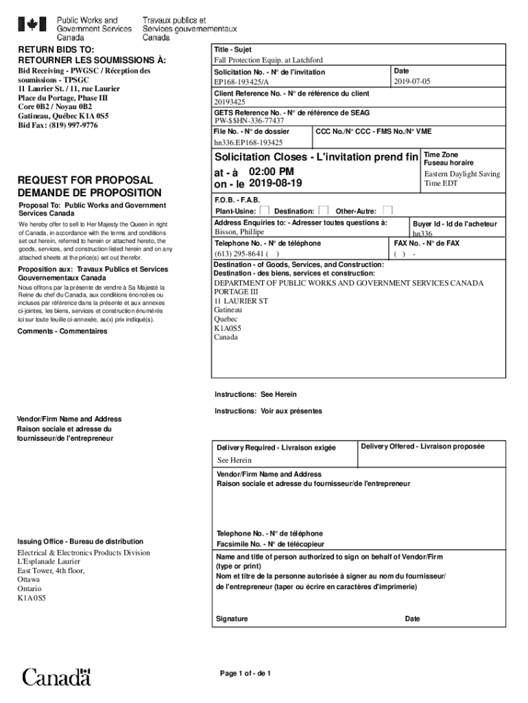 1 1RETURN BIDS TO: RETURNER LES COMMISSIONS :Title Outbid Receiving PW GSC / Reception DES sou missions TP SGC 11 Laurie St. / 11, rue Laurie Place du Portage, Phase III Core 0B2 / Royal 0B2 Gatineau,