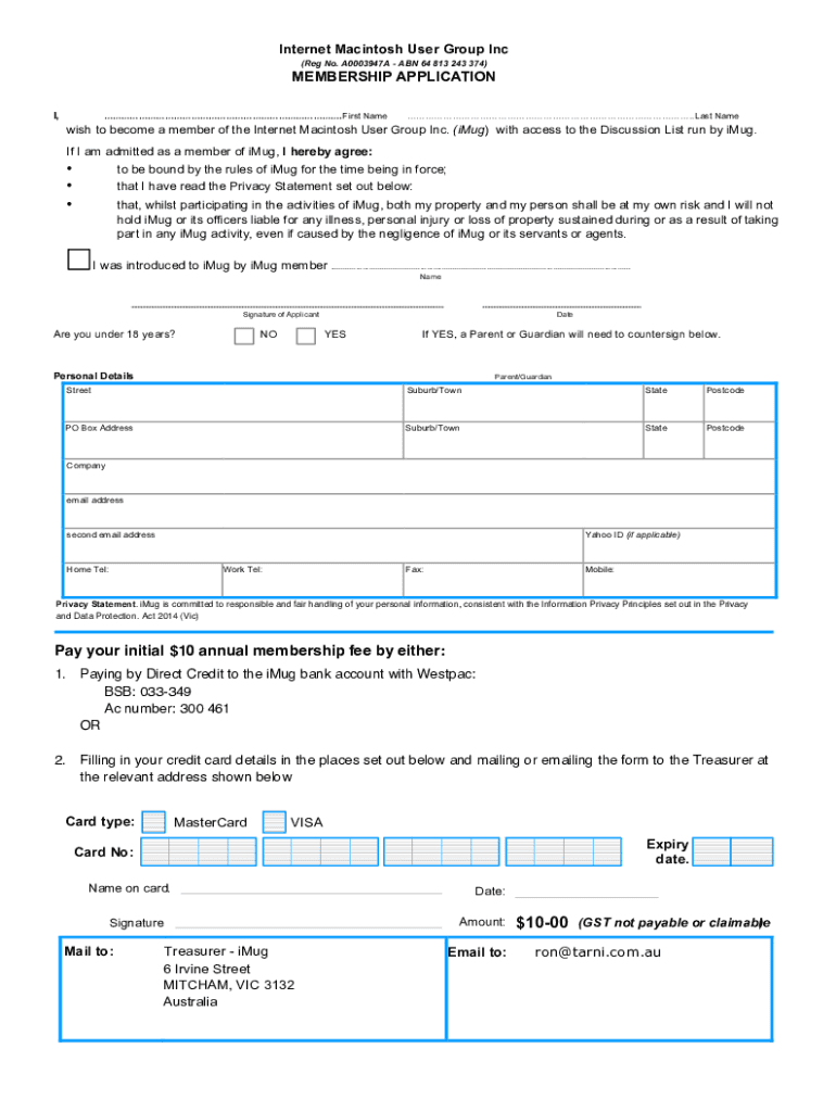 Internet Macintosh User Group Inc (Reg No. A0003947A ABN 64 813 243 374)MEMBERSHIP APPLICATION I, First Name. Last Name wish to become a member of the Internet Macintosh User Group Inc. (IMG) with