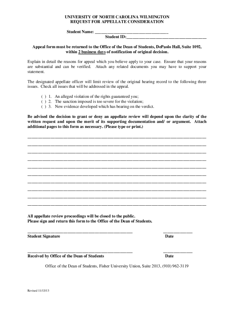 Get the free Request for Appellate Consideration form - UNC Wilmington