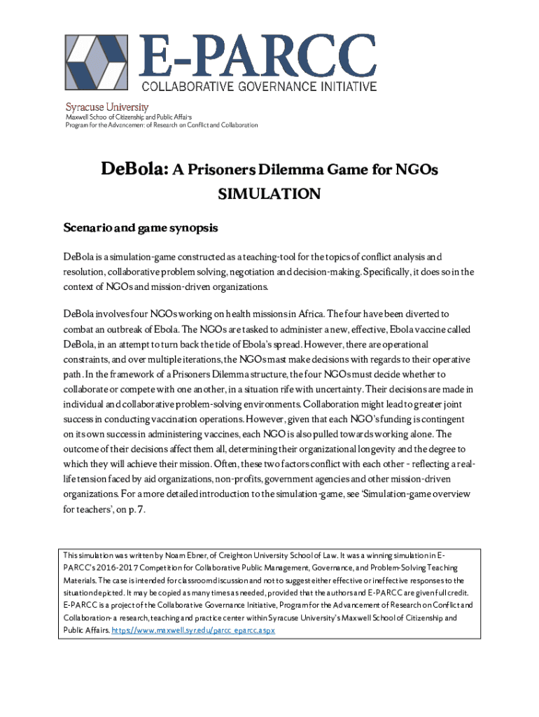 Get the free DeBola: A Prisoners Dilemma Game for NGOs SIMULATION