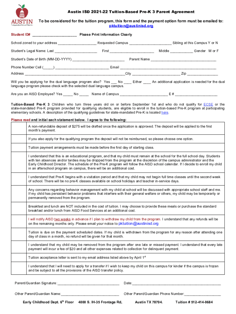 Austin ISD 202122 TuitionBased Prey 3 Parent Agreement To be considered for the tuition program, this form and the payment option form must be emailed to: pk tuition Austins.org Student ID# Please