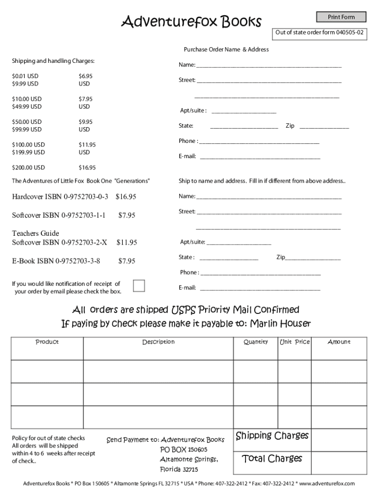 Adventure fox Footprint Form Out of state order form 04050502Purchase Order Name & Address Shipping and handling Charges: $0.01 USD $9.99 USD$6.95 USD$10.00 USD $49.99 USD$7.95 USD$50.00 USD $99.99