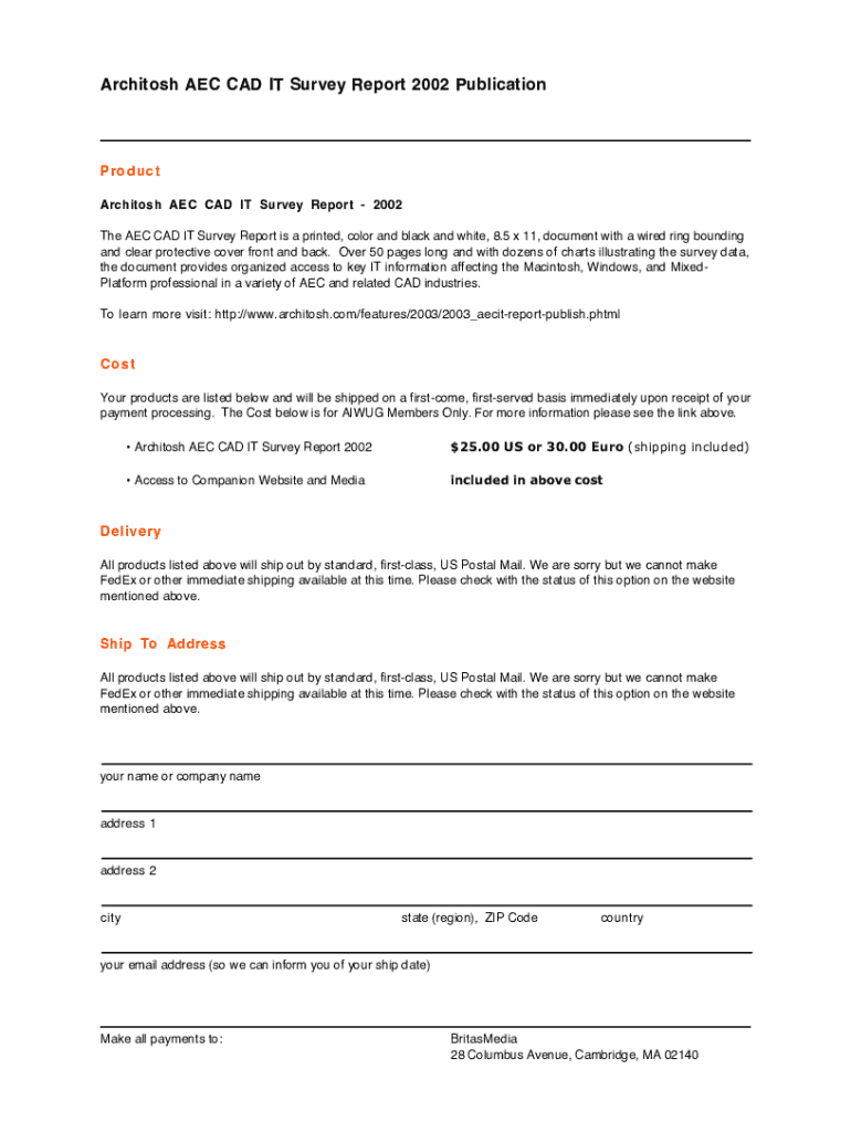 Architect AEC CAD IT Survey Report 2002 PublicationProduct Architect AEC CAD IT Survey Report 2002 The AEC CAD IT Survey Report is a printed, color and black and white, 8.5 × 11, document with a