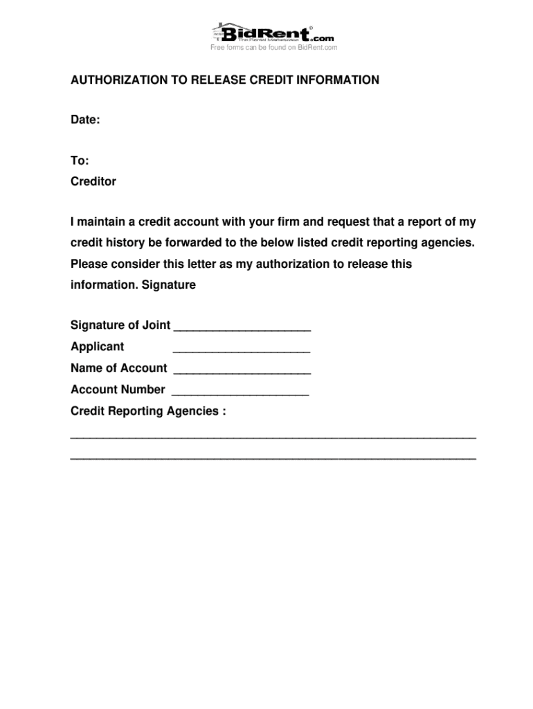 Free forms can be found on Brent. Authorization TO RELEASE CREDIT INFORMATION Date: To: Creditor I maintain a credit account with your firm and request that a report of my credit history be forwarded