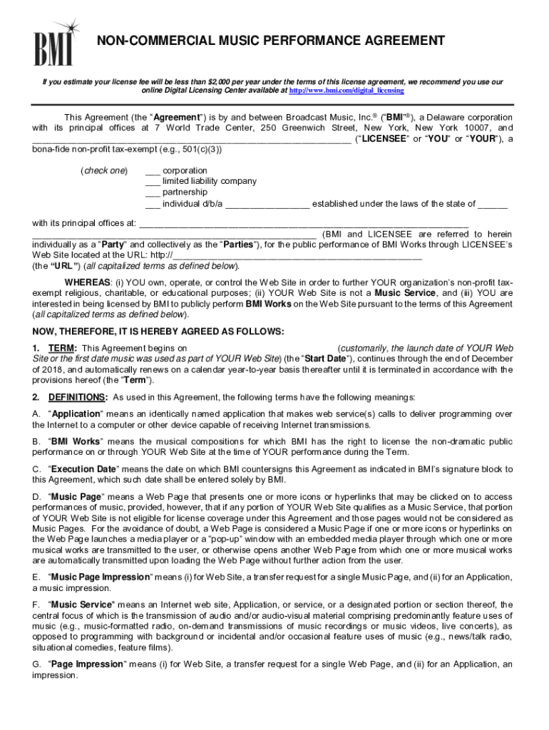 NONCOMMERCIAL MUSIC PERFORMANCE AGREEMENT If you estimate your license fee will be less than $2,000 per year under the terms of this license agreement, we recommend you use our online Digital Licensing