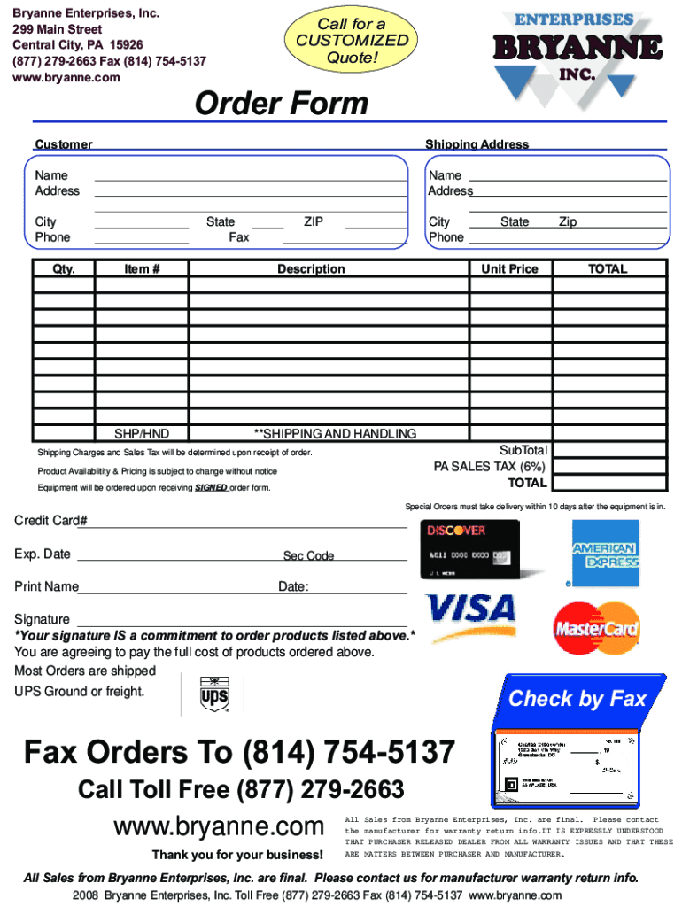 Bryan né Enterprises, Inc. 299 Main Street Central City, PA 15926 (877) 2792663 Fax (814) 7545137 www.bryanne.comENTERPRISESCall for a CUSTOMIZED Quote!BREANNE INC. Order Form Customer Shipping Addressable