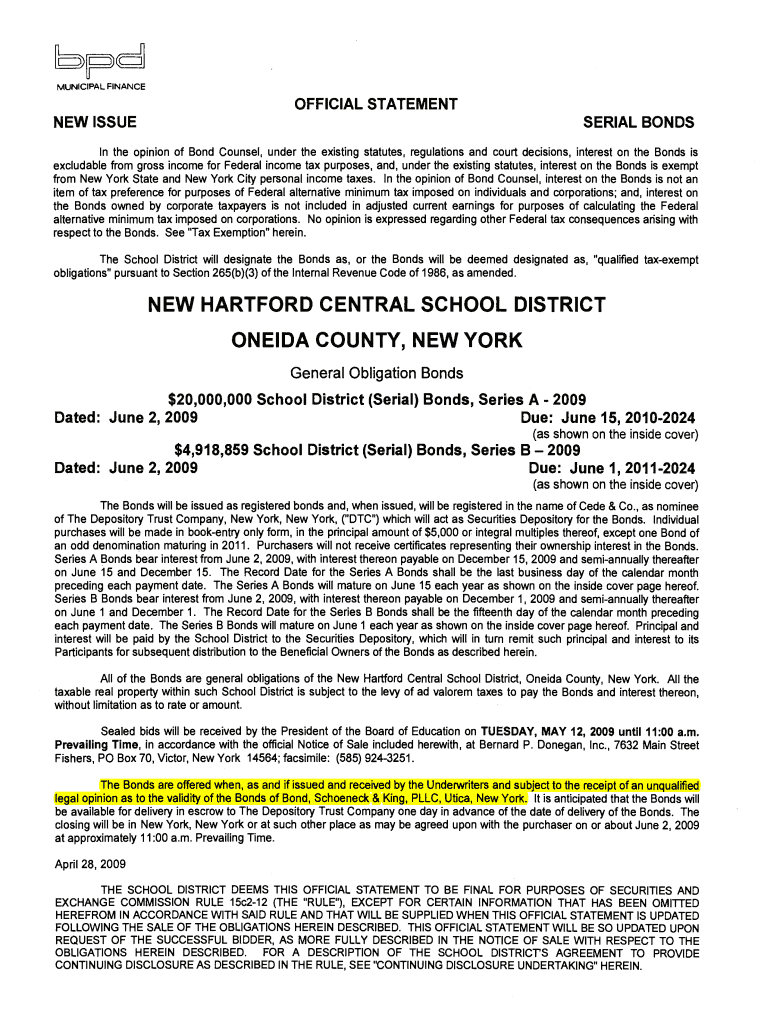 BPD MUNICIPAL FINANCE OFFICIAL STATEMENT NEW ISSUE SERIAL BONDS In the opinion of Bond Counsel, under the existing statutes, regulations and court decisions, interest on the Bonds is excludable from