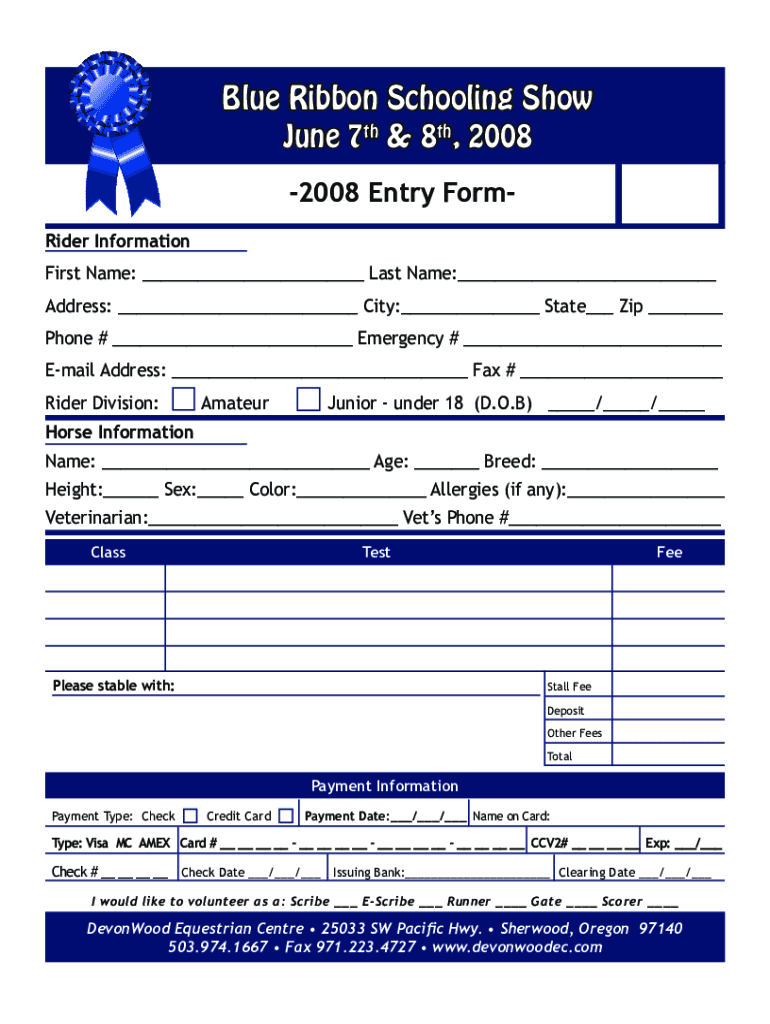 Blue Ribbon Schooling Show June 7th & 8th, 2008 2008 Entry Former Information First Name: Last Name: Address: City: State Zip Phone # Emergency # Email Address: Fax # Rider Division:Amateur Junior