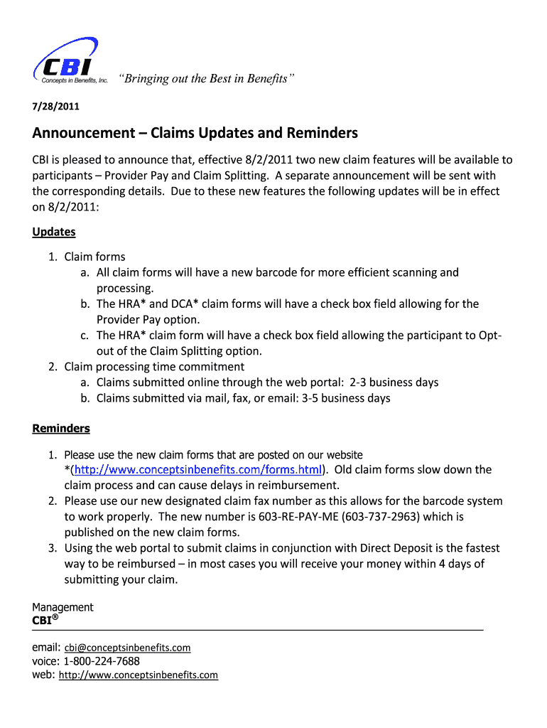 Bringing out the Best in Benefits 7/28/2011 Announcement Claims Updates and Reminders CBI is pleased to announce that, effective 8/2/2011 two new claim features will be available to participants Provider