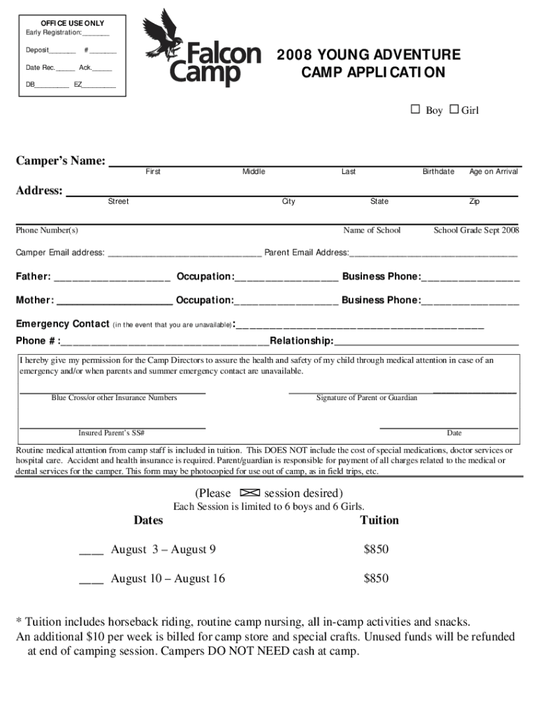 OFFICE USE ONLY Early Registration: Deposit # 2008 YOUNG ADVENTURE CAMP APPLICATIONDate Rec. ACK. DB EZ Campers Name: Address:FirstMiddleStreetLastGirlBirthdateCityStatePhone Number(s)Name of Schoolmate