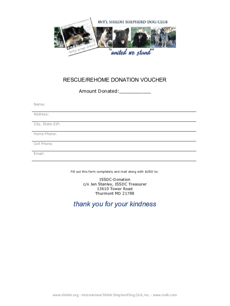 RESCUE/REHOMEDONATIONVOUCHER AmountDonated: Name: Address: City, State ZIP: Homophone: Cellphone: Email: Filloutthisformcompletelyandmailalongwith$USDto: ISSDCDonation c/oJenStanley, ISSDCTreasurer