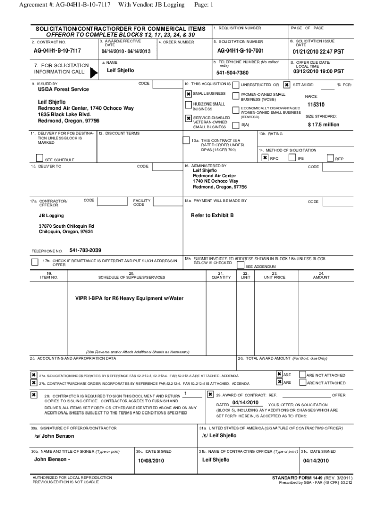 Agreement #: AG04H1B107117With Vendor: JB Logging Page: 1SOLICITATION/CONTRACT/ORDER FOR COMMERCIAL ITEMS OFFER OR TO COMPLETE BLOCKS 12, 17, 23, 24, & 30 3. AWARD/EFFECTIVE DATE2. CONTRACT NO.AG04H1B1071174.