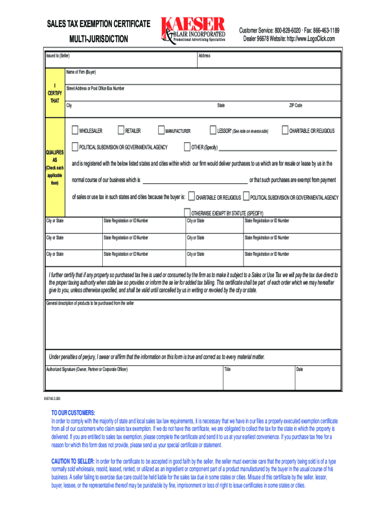 SALES TAX EXEMPTION CERTIFICATECustomer Service: 8008286020 Fax: 8664631189 Dealer 96678 Website: http://www.LogoClick.comMULTIJURISDICTION Issued to (Seller)Addressable of Firm (Buyer)I CERTIFY Bradstreet