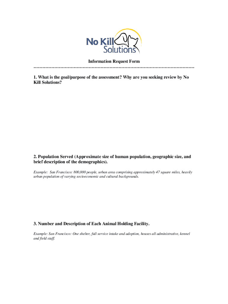 Information Request Form 1. What is the goal/purpose of the assessment? Why are you seeking review by No Kill Solutions?2. Population Served (Approximate size of human population, geographic size,
