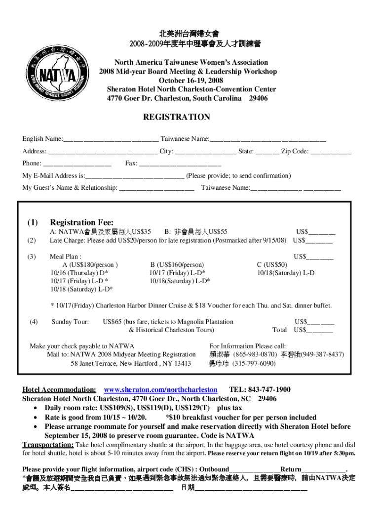 20082009 North America Taiwanese Women's Association 2008 Midyear Board Meeting & Leadership Workshop October 1619, 2008 Sheraton Hotel North CharlestonConvention Center 4770 Goer Dr. Charleston,